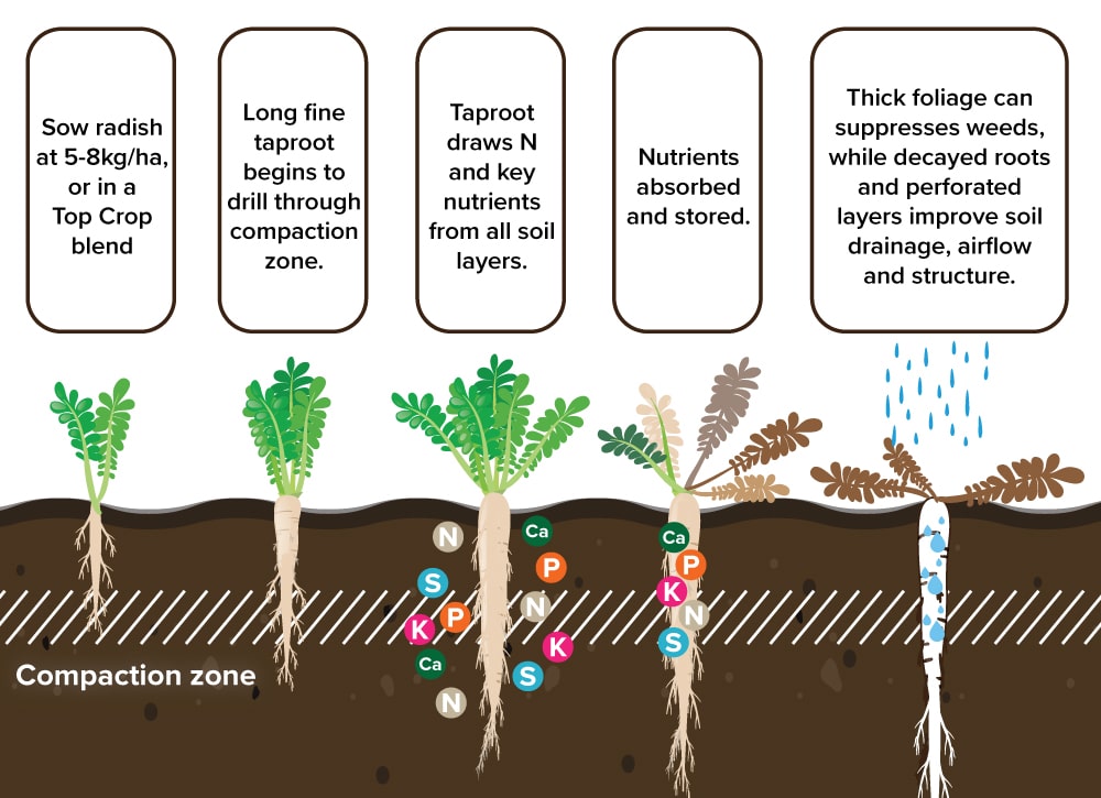 Forage Radish regenerates soil by breaking compaction, suppressing weeds, capturing and releasing nutrients, improving water infiltration, and adding green manure.