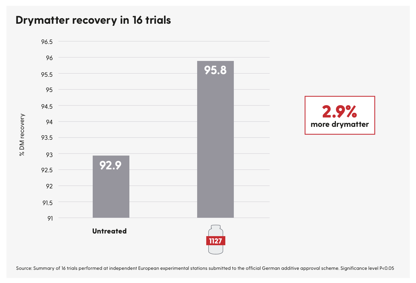 Drymatter recovery was improved by 2.9% when comparing untreated silages with those that were treated with 1127 meaning more feed was available to turn into milk or meat.