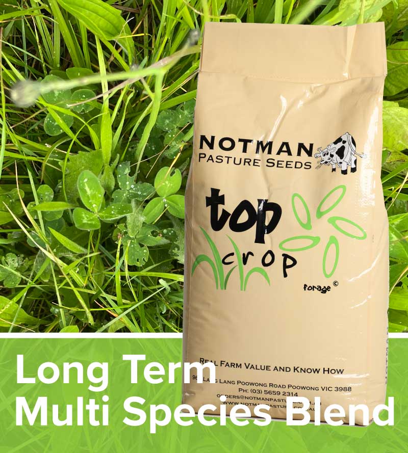 Long Term Mutli Species Blend is a diverse long-term multi species pasture blend combining grasses, legumes and herbs to improve soil health, persistence and forage quality across seasons.